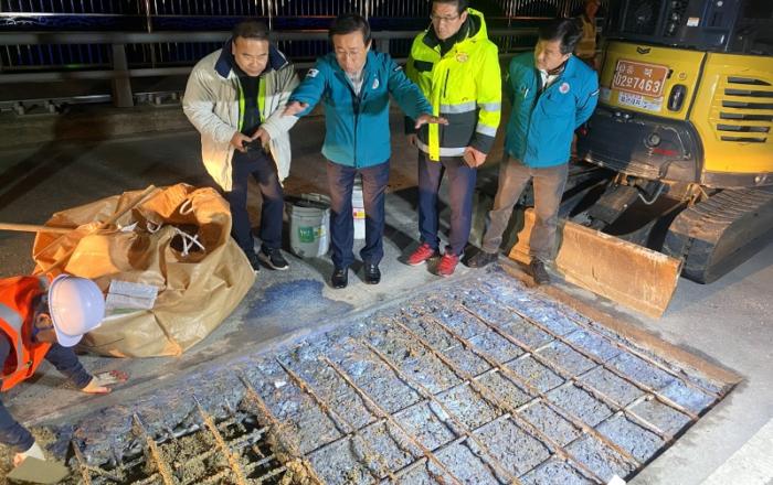 현장 점검하는 김문근 군수지난 7일 오후 2시 11분경 단양군 가곡면 519번 지방도인 가대교 200미터 지점의 상판에 지름 40cm 크기의 교량상판 싱크홀이 발생했다.단양군은 충청북도 도로사업소 충주지소에 연락하고 사고위험이 있어 현장에서 교통통제를 실시했
