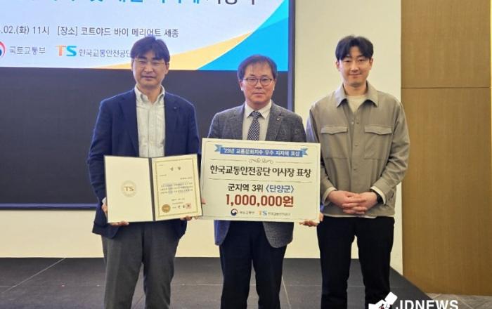 시상식 사진(좌측부터 박현수 교통팀장, 구본혁 민원과장, 이준호 주무관)충북 단양군이 2023년 교통문화지수 실태조사에서 전국 군 그룹 82개 지자체 중 3위를 차지하며 지난 2일 표창을 받았다.군은 2022년 평가 결과 82.81점으로 군 그룹 20위에 그
