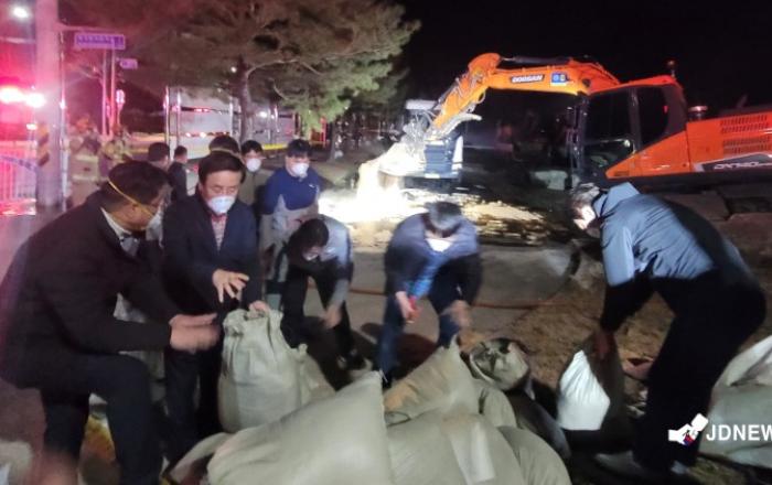 현장에서 업무지시하는 김문근 군수지난 2일 오후 10시 19분경 매포읍 평동리 회전교차로 옆 주차장에 주차된 탱크로리 차량에서 기름이 유출된다는 신고가 군청 당직실로 접수됐다.군은 즉시 소방서, 경찰서, 충주화학재난합동방재센터 등 관계기관과 협력해 긴급 조치를 실시했다
