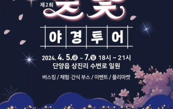 벚꽃 야경투어 홍보 포스터내륙관광 1번지 충북 단양군은 오는 5일부터 7일까지 ‘2024 단양군 벚꽃 야경투어’를 개최한다.지난해 첫선을 보인 단양군 벚꽃 야경투어는 올해 ‘별빛 아래, 조명과 벚꽃들의 향연’을 주제로 열린다.단양의 쏟아지는 별빛 속에서 아름다운 야경과