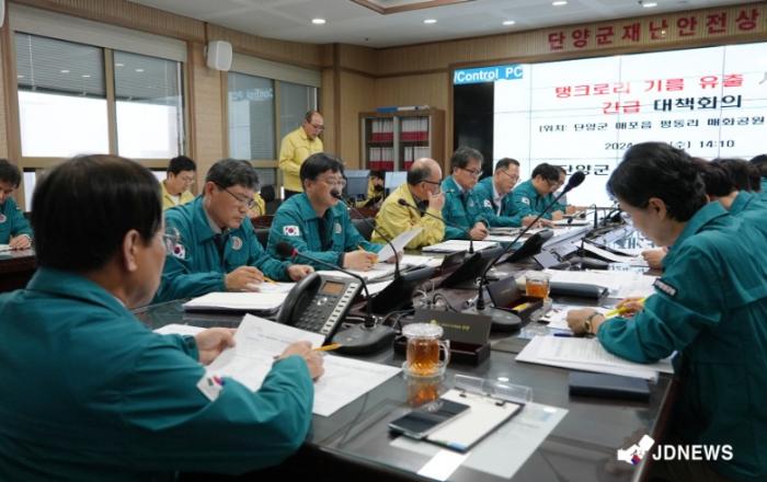 기름유출 사고 대책 회의 충북 단양군이 지난 2일 매포읍 평동리에서 일어났던 기름유출 사고와 관련해 대책 회의를 3일 열었다.이번 회의는 김문근 단양군수가 주재해 법령 저촉 사항과 제도적 결함 여부, 구상권 청구 등 세부적인 대책을 논의했고 유사 사례 재발 방