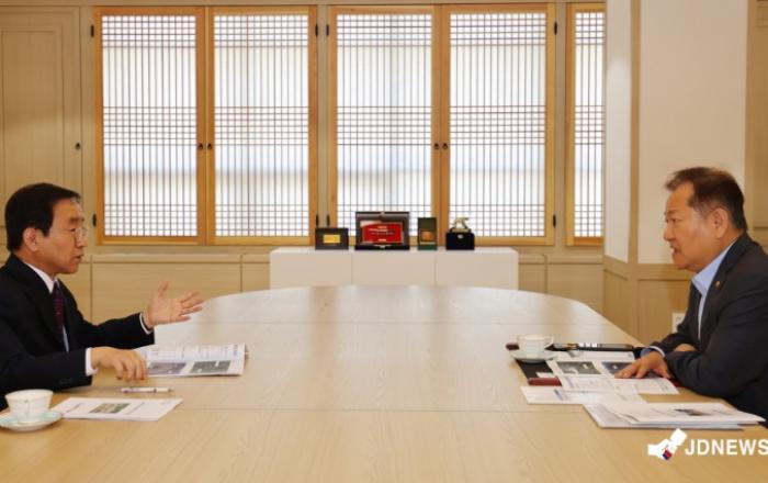 이상민 장관에게 현안 사업을 건의하는 김문근 군수김문근 단양군수는 지난 18일 이상민 행정안전부 장관을 만나 단양군 현안 사업을 건의했다.김 군수는 인구감소지역 지자체-정부 회의 후 장관실에서 달맞이길 침수에 따른 도로높임공사 시행, 교부세 확보, 단양군의 특수여건을