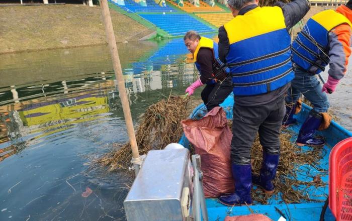 부유물 제거 사진 단양군과 한국수자원공사 충주댐지사(지사장 안제식)은 지난 8일부터 10일까지 3일 동안 단양 시내 구간의 단양강 부유물을 제거했다.최근 잦은 비로 지류 하천 주변의 초목류 잔재물과 생활 쓰레기들이 강으로 유입돼 수변에는 다량의 초목류와 쓰레기