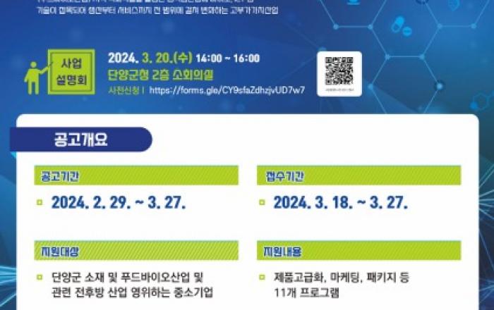 푸드바이오산업 육성 홍보포스터단양군이 푸드바이오산업 육성을 위해 기업지원에 발벗고 나섰다.군은 지역 특화 작물을 활용한 농식품산업에 적극 투자해 군 경제 산업의 중추를 지탱해 줄 고부가가치산업을 적극 육성할 계획이다.단양군 소재 푸드사이오산업 관련 중소기업에 총 약 2