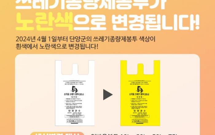 쓰레기종량제봉투 색상변경 홍보 리플릿충북 단양군은 4월 1일부터 쓰레기종량제봉투 색상을 노란색으로 변경한다.군은 환경부의 ‘쓰레기 수수료 종량제 시행 지침’에 따라 쓰레기종량제봉투를 종전 흰색에서 누구나 한눈에 봉투를 구분할 수 있는 노란색으로 변경했다.이번 변경은 1