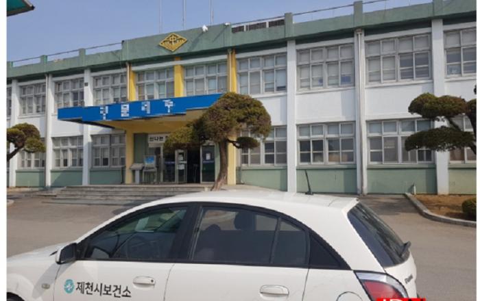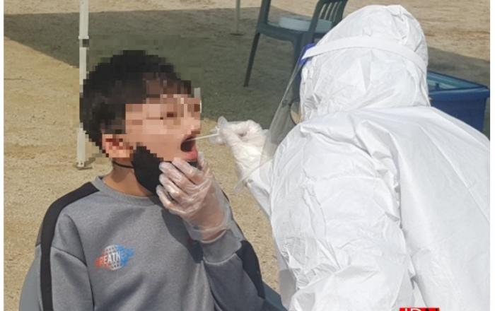 ▲중학교 1학년 학생이 코로나19에 확진 판정을 받아 학교 운동장에 임시 선별진료소를 설치하는 모습JD News 이용희 기자 = 제천지역의 A 중학교 학생이 신종 코로나바이러스 감염증(코로나19) 양성을 판정을 받아 11일 오전11시부터 학생 550여명을 전수 검사한다