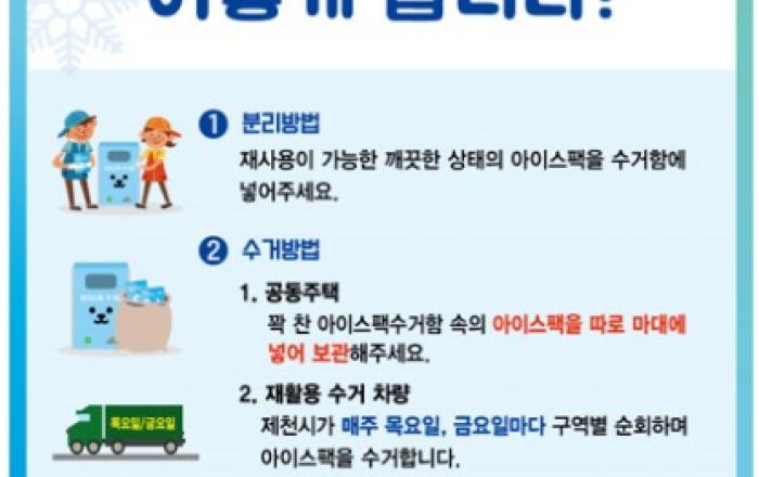 ▲ 아이스팩 재사용 홍보물JD News 이용희 기자 = 제천시는 코로나19의 영향으로 비대면 쇼핑을 통한 아이스팩 사용량이 급격히 증가함에 따라, 주요 사업장을 대상으로 환경보호와 구입비용 절감을 위한 아이스팩 재사용 촉진에 나섰다. 한번 사용하고 버려지는