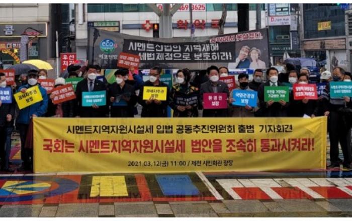 ▲ 12일 제천시민회관 광장에서 시멘트세 도입을 위한 공동추진위원회가 출범식 기자회견 진행JD News 이용희,유소진 기자 = 시멘트 생산지역인 충북·강원·전남·경북지역 지방자치단체와 주민 등이 시멘트 지역자원시설세(이하 시멘트세) 도입을 위한 공동추진위원회(이하 공추
