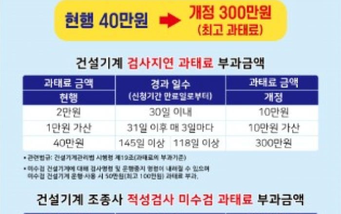 충북 제천시는 개정된 '건설기계관리법'시행에 따라 건설기계 검사 미수검 차량과 적성검사 미수검 건설기계 조종사에 대한 행정제재를 강화한다고 밝혔다.28일 제천시는 오는 8월 4일자로 시행되는 개정 법률에 따라 정기검사 지연기간이 30일 이내인 경우 과태료가 종전 2만