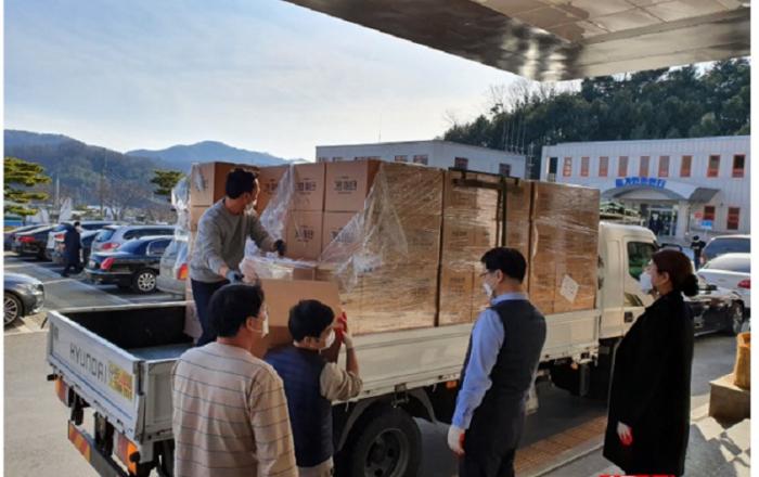 ▲ WK뉴딜국민그룹 마크스 기탁모습JD News 이용희 기자 = 제천시는 지난달 28일 WK뉴딜국민그룹(총재 박항진)이 1억 원 상당의 덴탈마스크 30만 매를 기탁했다고 밝혔다. 이날 기탁은 임종승 청풍중학교 총동문회장과 삼양기업 최춘희 대표의 주선을 통해