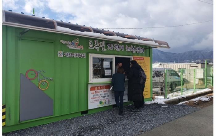 ▲ 초록길 자전거체험센터JD News 이용희 기자 = 제천시가 자전거 이용 활성화와 친환경 녹색도시 실현을 위해 작년에 이어 올해에도 삼한의 초록길 일원에서 “초록길 자전거체험센터'를 운영한다. 올해는 작년보다 21대 증가한 59대를 운영하여 성인용