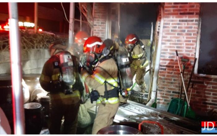 ▲4일 진화작업중인 소방관모습JD News 이용희 기자 = 4일 오전 6시쯤 충북 제천시 동현동의 한 주택에서 화재가 발생해 집주인 A씨(82)가 숨졌다.이날 화재는 근처를 지나가던 목격자가 119에 신고해 20여분 만에 진화됐다.이 불로 1층에 있던 80대 남성은 숨
