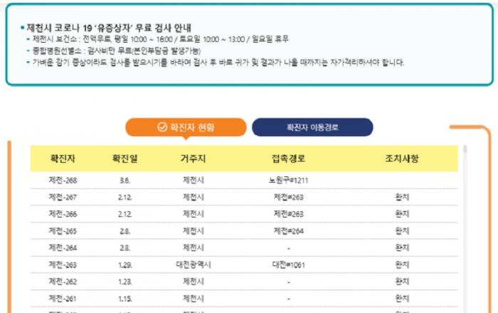 ▲ 6일 제천시 홈페이지 코로나19 확진자 현황JD News 이용희 기자 = 충북 제천지역에 신종 코로나바이러스 감염증(코로나19) 60대 남성 A(제천 268번)씨 확진자가 1명 추가 됐으며, 지난달 12일 이후 22일만이다.6일 제천시에 따르면