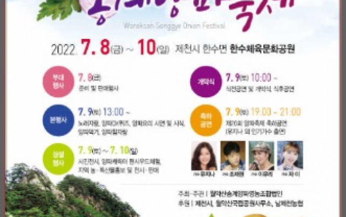 신종 코로나바이러스 감염증(코로나19)로 인해 2년여 동안 휴식기에 들었던 양파 직거래 한마당 축제 '제20회 월악산송계양파축제'가 오는 7월 8일부터 10일까지 충북 제천시 한수면 소재 '한수체육문화공원'에서 펼쳐진다.월악산양파영농조합법인이 주최하며, 한수면 송계양파