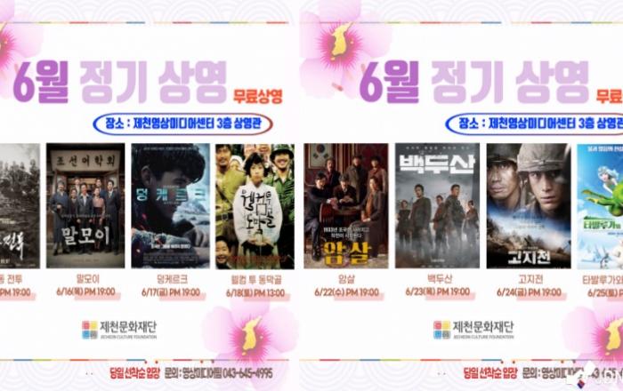 8일 (재)제천문화재단 제천영상미디어센터는 호국・보훈의 달을 맞아 오는 6월 15일부터 25일까지 6월 정기상영을 운영한다고 밝혔다.본 행사는 제천영상미디어센터 3층 상영관에서 진행되며, 상영작은 15일 오후 7시 '봉오동 전투', 16일 오후 7시 '말모이', 17일