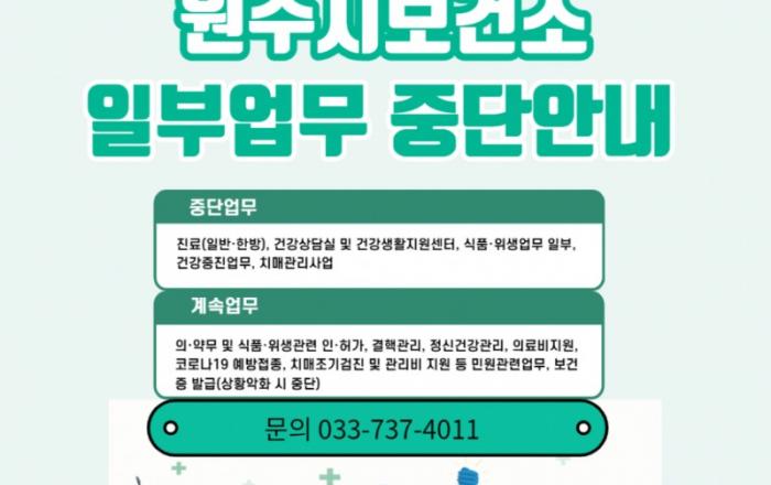 강원 원주시보건소는 최근 오미크론 변이바이러스 대유행에 따라 금일(24일)부터 확진자 발생 단계별 일부 업무를 잠정 중단하고 신종 코로나바이러스 감염증(코로나19) 대응 업무에 총력을 기울인다고 밝혔다.이번 조치로 진료(일반·한방), 건강생활지원센터, 건강증진 및 치매