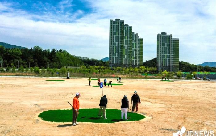 ▲ 신월동 미니복합타운 미분양 부지내 개장된 파크골프장 전경충북 제천시가 중전 파크골프구장의 임시 휴장으로 파크골프를 즐길 수 없는 시민들을 위해 신월동 미니복합타운 미분양 부지내 18홀의 파크골프 임시구장을 개장했다.12일 제천시에 따르면 신월동 행복주택 미
