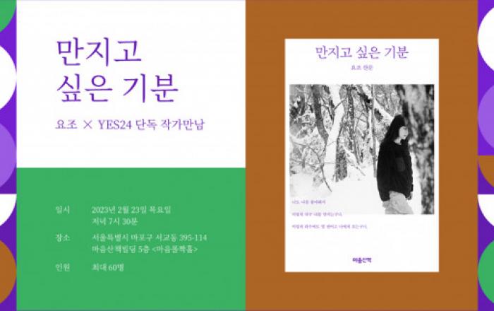 대한민국 대표 서점 예스24가 요조의 산문집 ‘만지고 싶은 기분’ 출간을 기념하며 작가와 함께하는 작가만남 행사 상품을 단독 판매한다.이번 작가만남 행사는 가수이자 작가인 요조의 신작 산문집 ‘만지고 싶은 기분’ 출간을 기념해 기획됐다. ‘만지고 싶은 기분’은 평범한