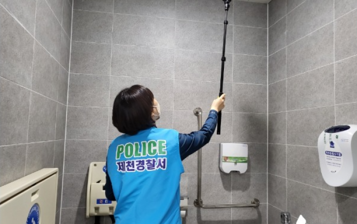 ▲ 청풍호반 케이블카 내 공중화장실 불법촬영 카메라 설치여부 점검하는 모습충북 제천경찰서가 나들이 철을 맞아 청풍호반 케이블카 내 공중화장실 불법촬영 카메라 설치여부를 점검했다.15일 제천경찰서에 따르면 벚꽃 명소인 청풍호를 찾는 지역주민과 관광객의 불법촬영에 대한 불
