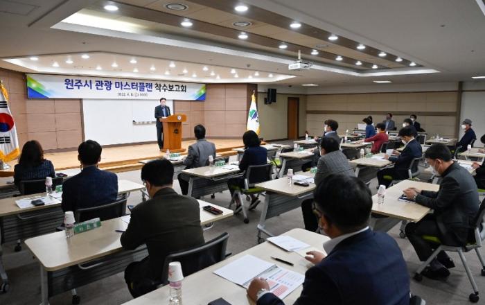 ▲ 원주시 관광 마스터플렌 착수보고회 모습강원 원주시가 변화하는 관광 트렌드에 선제적으로 대응하기 위한 중장기 관광 발전 전략 수립을 시작한다.4월 8일 조종용 원주시장 권한대행을 비롯한 관계 공무원 100여 명이 참석한 ‘원주시 관광 마스터플랜 수립’ 연구 용역 착수