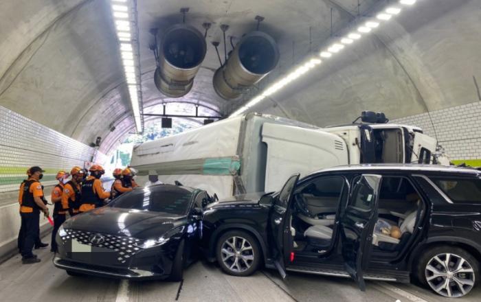 ▲ 9일 오전 평택제천고속도로 제천 방향 금성터널에서 8.5톤 화물차와 차량 6대 등이 잇따라 추돌하는 사고가 발생했다. (사진=제천소방서 제공)9일 충북 제천시 청풍면 평택제천고속도로 제천 방향 금성터널에서 8.5톤 화물차와 차량 6대 등이 잇따라 추돌하는 사고가 발