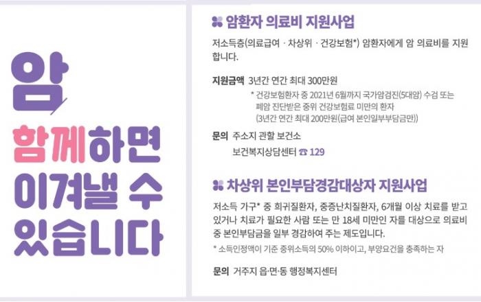 충북 제천시보건소는 보건복지부 지침에 따라 저소득층 암환자의 경제적 부담을 완화하기 위해 암 진단 검사비, 치료비 및 관련 약제비를 지원하고 있다.성인 암환자의 경우 의료급여수급권자 및 차상위 본인부담경감대상자를 대상으로 연간 최대 300만 원까지 연속해서 3년간 지원