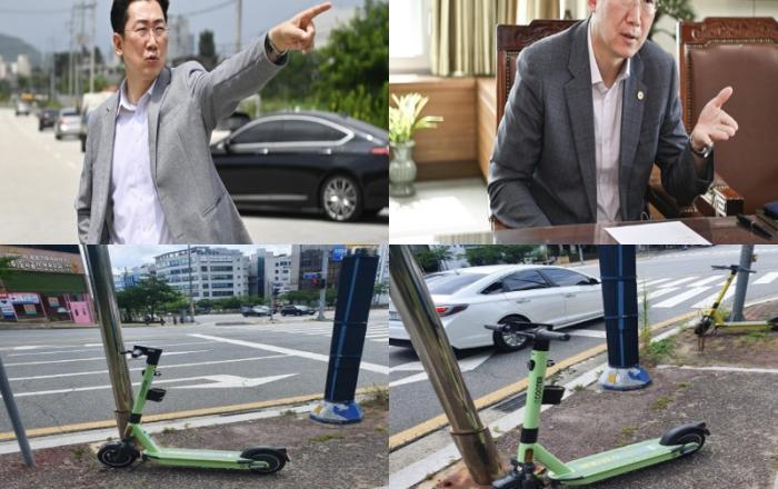 ▲ 원주시 전동 킥보드 관련 사진원강수 원주시장이 시민들의 보행 불편과 안전사고를 유발하고 있는 공유 전동킥보드 불법행위를 근절하기 위해 강력한 의지를 내보이고 있다.도내 상반기 전동킥보드 교통법규 위반행위가 2천여 건, 관련 교통사고가 19건이 발생하는 등 전동킥보드