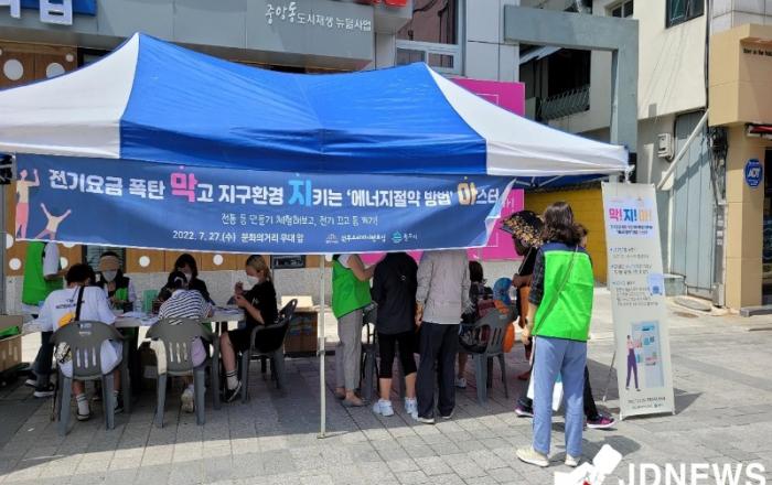 ▲ 여름철 에너지절약 캠페인 사진 강원 원주시와 (사)원주소비자시민모임(대표 황교희)는 7월 27일 문화의거리 상설공연장 앞에서 2022년 여름철 에너지절약 캠페인을 개최했다.이날 캠페인에서는 “막!지!마! (전기요금 폭탄 막고 지구환경 지키는 에너지절약 방법