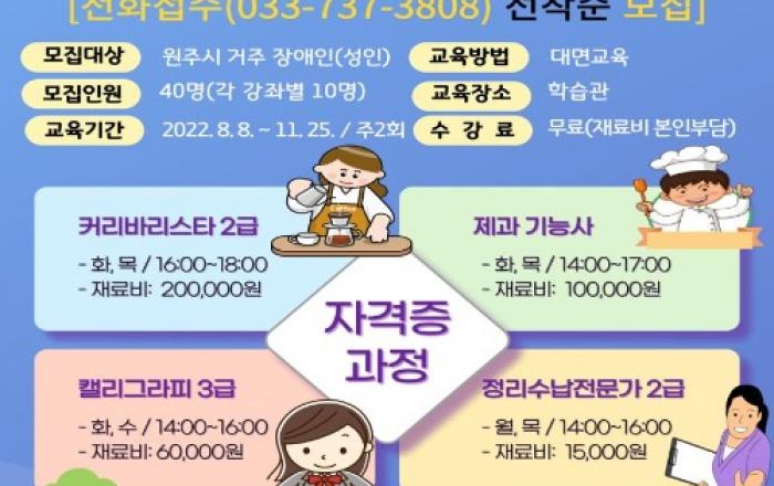 ▲ 전문기술강좌 수강생을 모집 포스터강원 원주시 평생교육원 학습관은 장애인과 함께하는 ‘어깨동무 행복 더하기’ 전문기술강좌 수강생을 모집한다.이번 강좌는 커피바리스타 2급, 제과 기능사, 캘리그라피 3급, 정리수납 전문가 2급 등 4개 과정으로 마련됐다.7월 18일부터