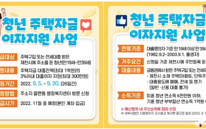 충북 제천시가 청년들의 안정적인 주거 환경 지원을 위해 9월 5일부터 30일까지 청년 주택자금 이자지원 사업 신청자를 모집한다.대상은 주택구입자금 또는 전세보증금 대출받은 지역내 거주 중인 만 19세이상 만 39세이하 청년으로, 주택자금 대출잔액(최대 1억 원)의 3%