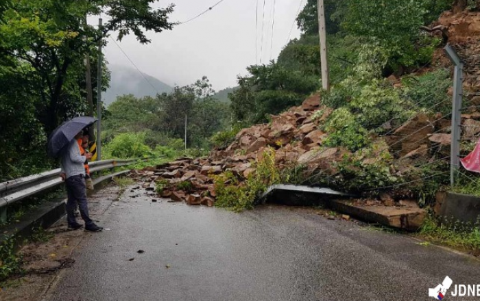 5일 오후 1시 30분경 충북 제천시 금성면 월굴리 지방도로에서 산사태가 발생해 왕복 2차선 도로가 전면 통제됐다.이날 산사태로 인해 도로 폭 30m 구간이 낙석으로 덮히면서 높은다리교에서 금성면 중전리 간 양방향 도로를 통제하고 현재 긴급 복구반을 편성해 복구작업 중