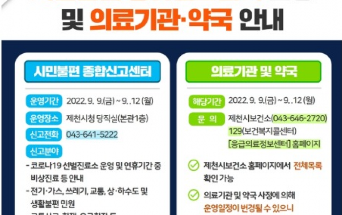 충북 제천시보건소가 다가오는 추석을 맞아 시민들이 건강하고 안전한 명절을 보낼 수 있도록 연휴 기간 동안 응급진료체계를 구축·운영한다고 7일 밝혔다.지역 응급의료기관인 제천서울병원과 명지병원은 응급환자 발생에 대비해 24시간 응급실을 열고 있으며, 병원 진료 및 의약품