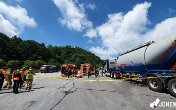 ▲ 도로로 유출된 독극물로 인해 소방당국이 긴급방재작업을 벌이고 있다.충북 제천시 명지동 인근 한 휴게소에서 정차를 하던 탱크로리에서 독극물인 황산이 누출돼 소방당국이 긴급조치에 나섰다.12일 오전 10시경 제천시 명지동 인근 한 휴게소에 정차하려던 운송 차