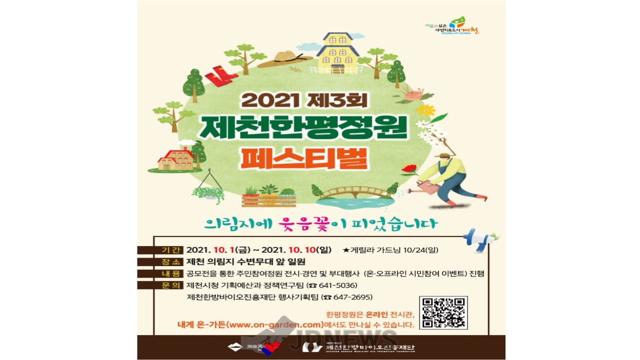 JD News 유소진 기자 = 주민참여를 통한 정원문화 확산과 생활 속 녹지공간의 재생으로 지역공동체를 강화하는 '2021 제3회 제천 한평정원 페스티벌'이 오늘(1일)부터 10일까지 의림지 수변무대 앞 일원에서 진행된다.