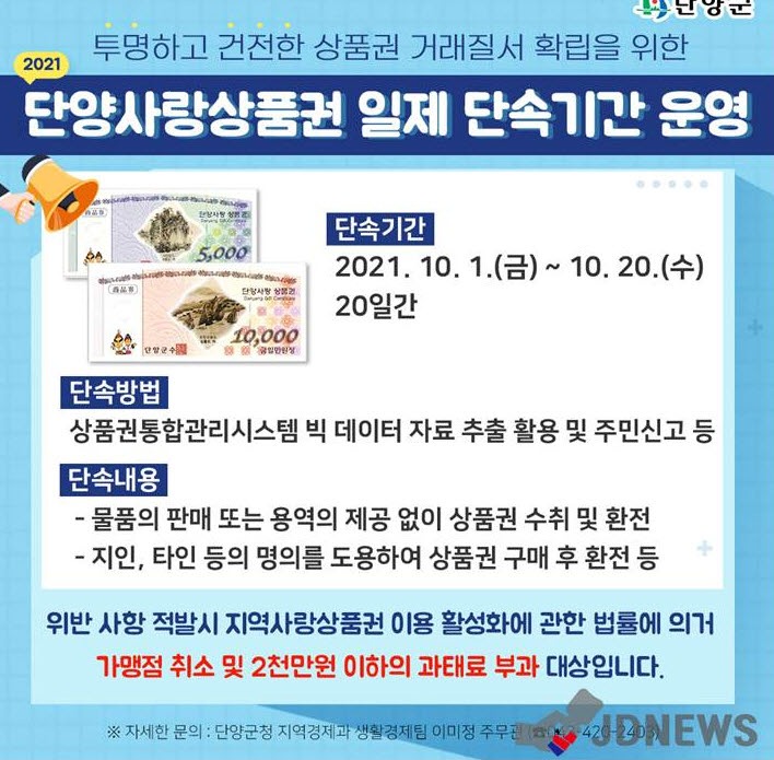 JD News 석의환기자 = 충북 단양군은 행정안전부의 ‘지역사랑상품권 부정유통 일제단속 계획’에 따라 단양사랑상품권의 부정유통 근절 및 건전한 유통질서 확립을 위해 일제단속을 실시한다고 밝혔다.