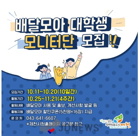 JD News 유소진 기자 = 충북 제천시에서 ‘공공배달앱 배달모아 대학생 모니터단’을 모집한다고 12일 밝혔다.