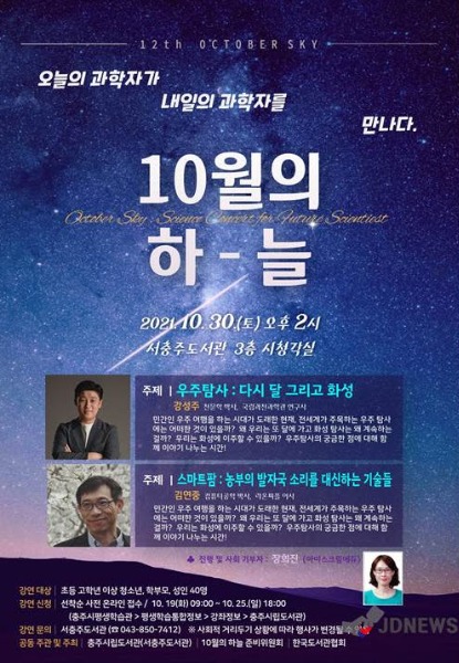 20일 서충주도서관에 따르면 오는 10월 30일 오후 2시에 과학자들의 재능기부 과학 강연 ‘10월의 하늘’을 개최한다고 밝혔다.
