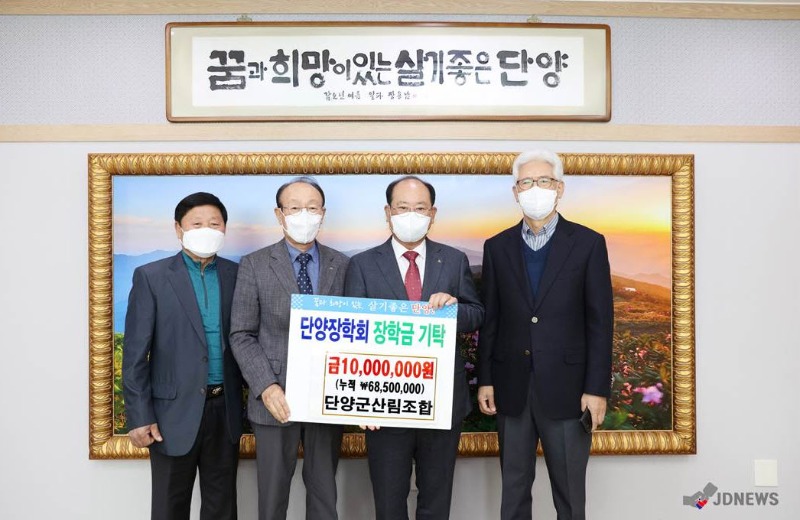 JD News 석의환기자 = 충북 단양군 산림조합(조합장 최인규)에서 지역인재 육성을 위한 장학금 1,000만원을 단양장학회(이사장 류한우 단양군수)에 기탁했다.