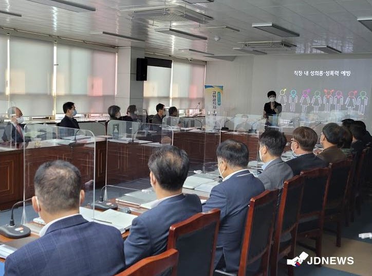 이날 교육은 2021년부터 변경된 폭력 예방 교육 운영 지침에 따라 기관장 및 5급 이상 고위공직자 36명을 대상으로 한국범죄학연구소 선임연구위원인 민수진 강사를 초빙해 ‘성희롱·성폭력 예방 교육’을 주제로 강의를 진행했다.