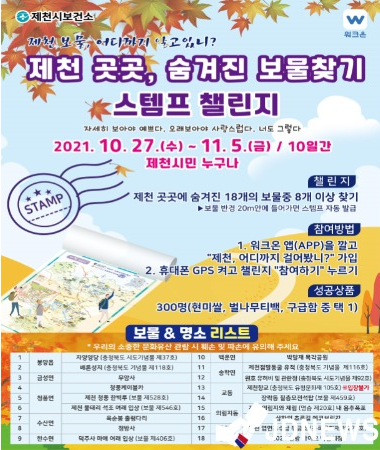 오늘(27일)부터 11월 5일까지 10일간 진행되는 이번 행사는 제천의 문화유산과 관광명소 18개소 중 8개소 이상 방문하여 보물 반경 20미터 안에 들어가면 스템프가 자동으로 발급되는 이벤트이다.