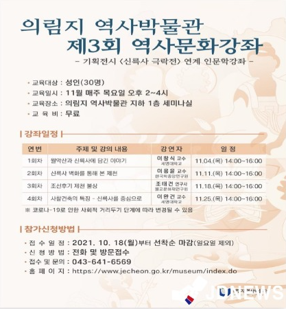 JD News 유소진 기자 = 충북 제천시 의림지 역사박물관은 오는 11월부터 성인대상 교육프로그램인 제3회 역사문화강좌를 개최한다고 28일 밝혔다.