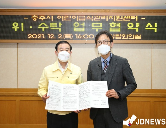 충북 충주시가 지난 2일 시청 중앙탑회의실에서 충주시 어린이급식관리지원센터 수탁기관으로 선정된 건국대학교 글로컬산학협력단과 위·수탁 협약을 체결했다.