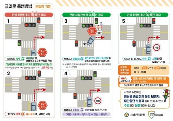 - 운전자, 차량 신호등 적색일 때 우회전 시 정지선, 횡단보도 등 정지한 후 우회전해야...