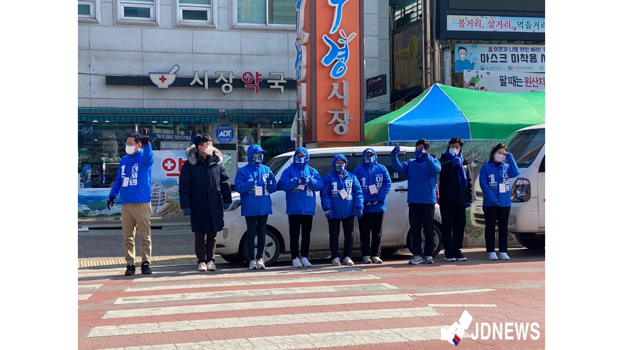 단양구경시장 앞 출정식에는 지방의원, 출마예정자들, 민주당원, 선거운동원과 지지자들이 모여 대선 승리를 위한 결의를 다졌다.