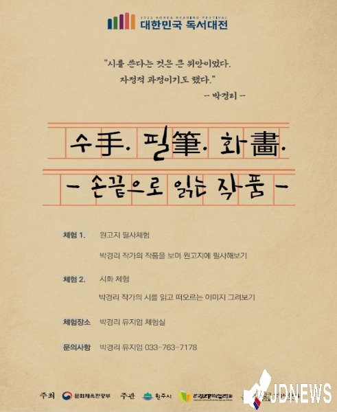 원주시립중앙도서관장은 “코로나19로 지쳐있는 국민이 박경리 작가의 작품을 통해 위로 받을 수 있는 계기가 되길 바란다”며 “2022 대한민국 독서대전의 성공적인 추진으로 전국적인 독서문화 활성화가 이루어질 수 있도록 노력하겠다”고 말했다.