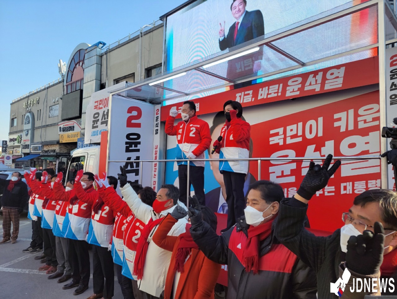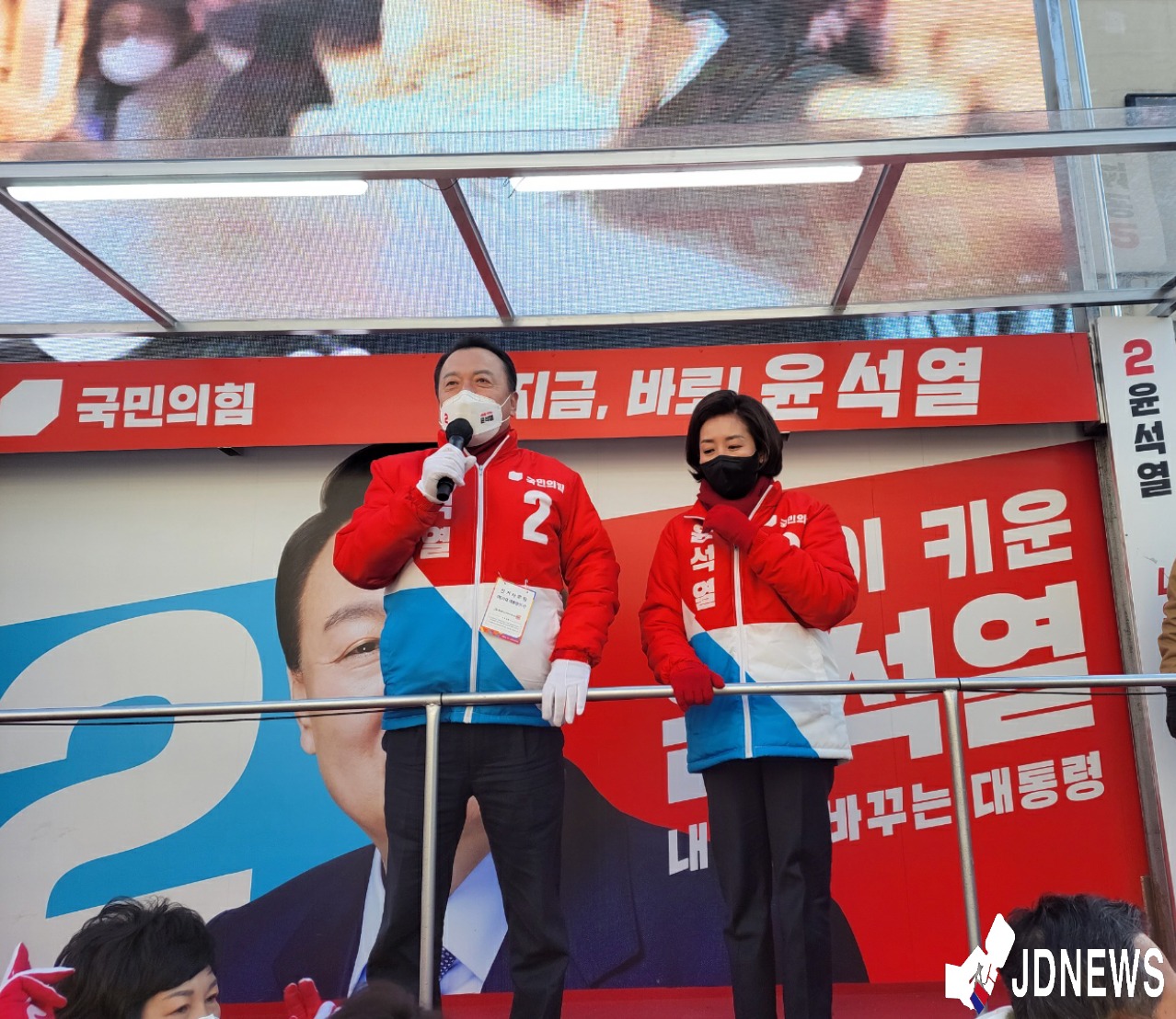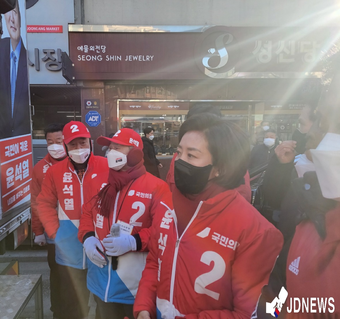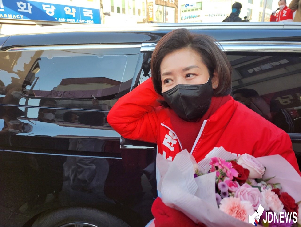 나경원 국민의 힘 전 원내대표가 충북 제천시를 방문해 윤석열 후보 지지를 호소했다.