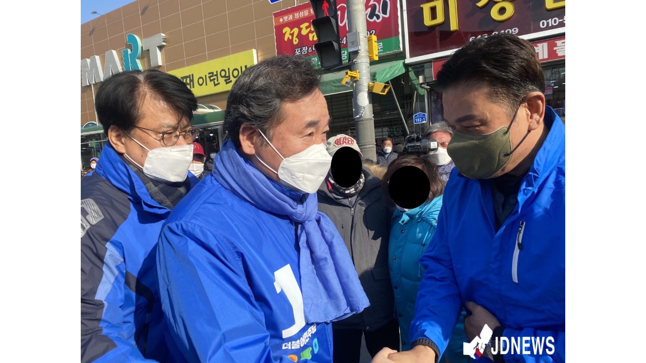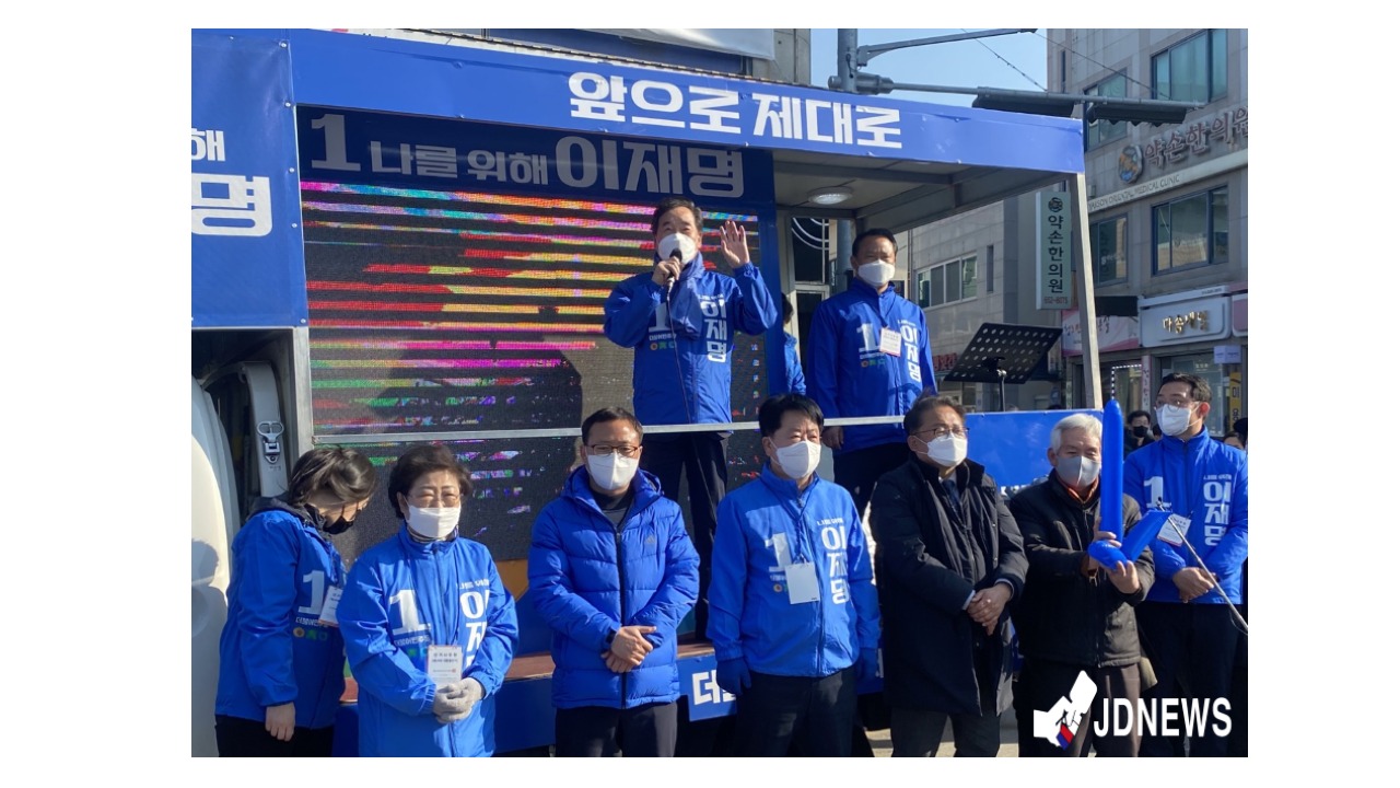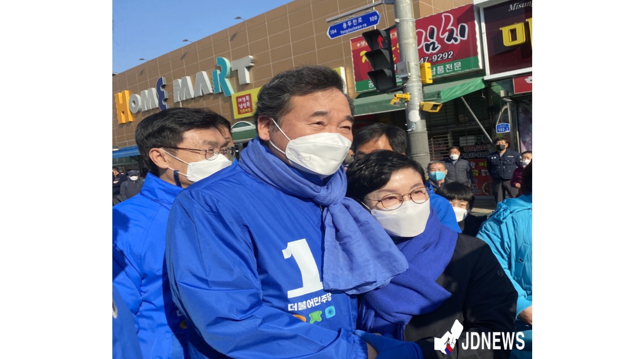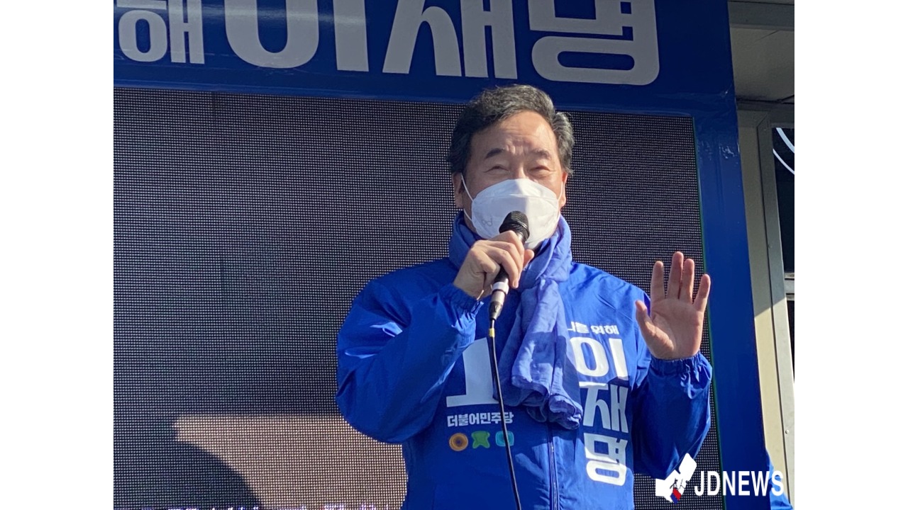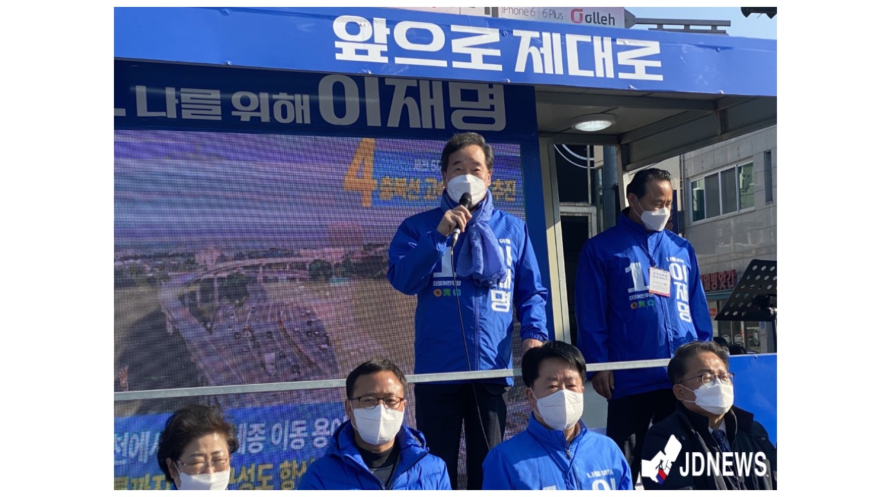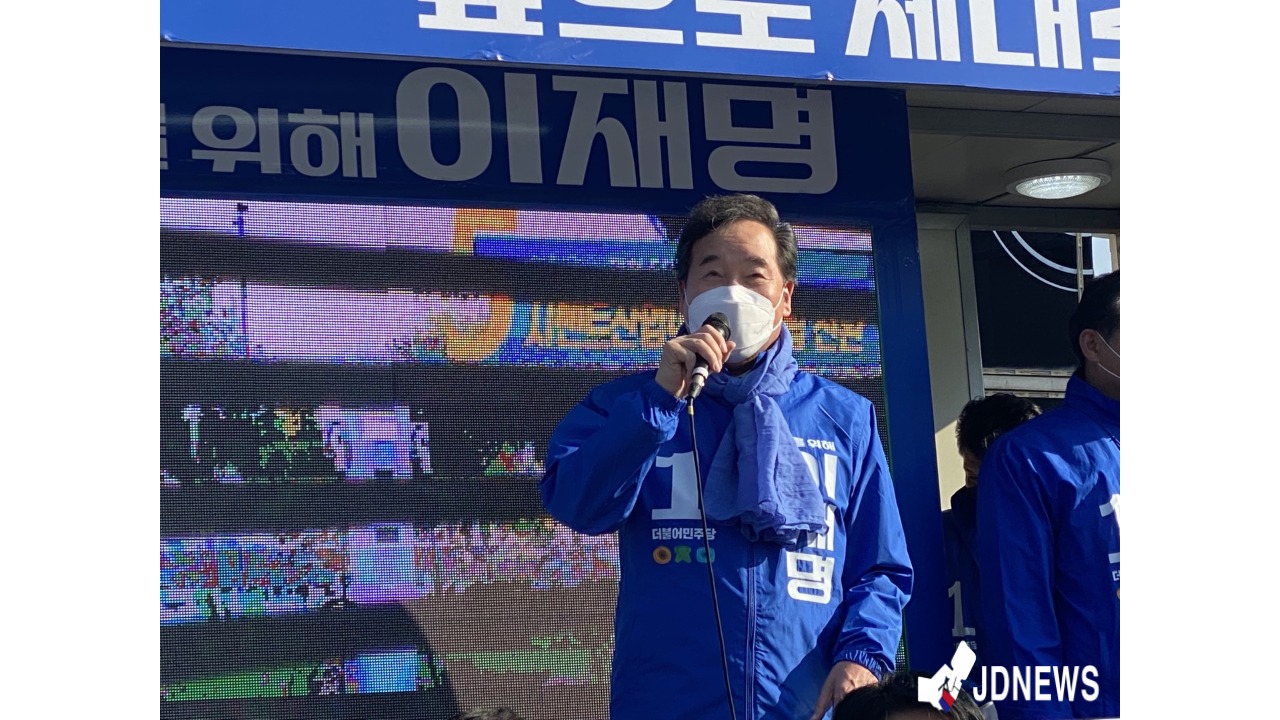 3일 오후 3시경 더불어 민주당 이낙연 총괄 선대위원장이 충북 제천시 중앙시장 홈마트 앞에서 이재명 후보 지지를 호소했다.
