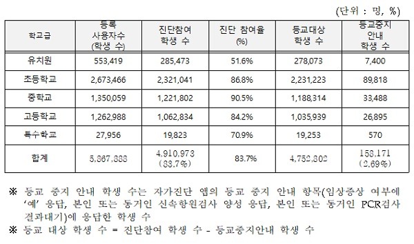 자가진단 앱을 통해 등교 중지가 안내된 학생은 15만 8,171명으로 2.69%에 이른다.
