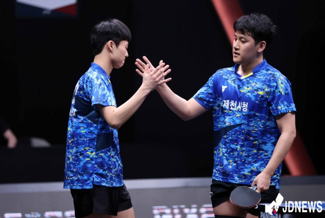 충북 제천시청 탁구팀이 지난 15일 경기도 수원시 광교씨름체육관(STUDIO T)에서 열린 ‘2022 두나무 한국프로탁구리그(KTTL)’ 내셔널리그 남자부 경기에서 서울시청을 상대로 3대 2 역전승을 거두며 3연승 행진을 이어가고 있다.