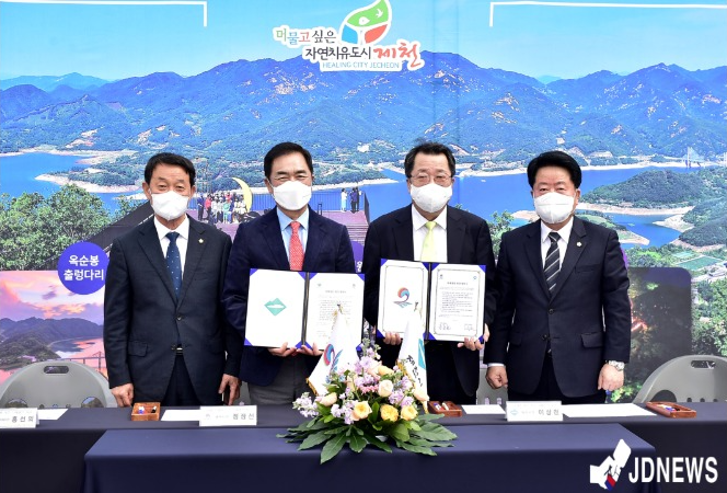 충북 제천시와 경기도 평택시가 금일(17일) 제천 청풍호반 케이블카에서 양 지자체의 공동발전을 위한 자매결연 협약을 체결했다.